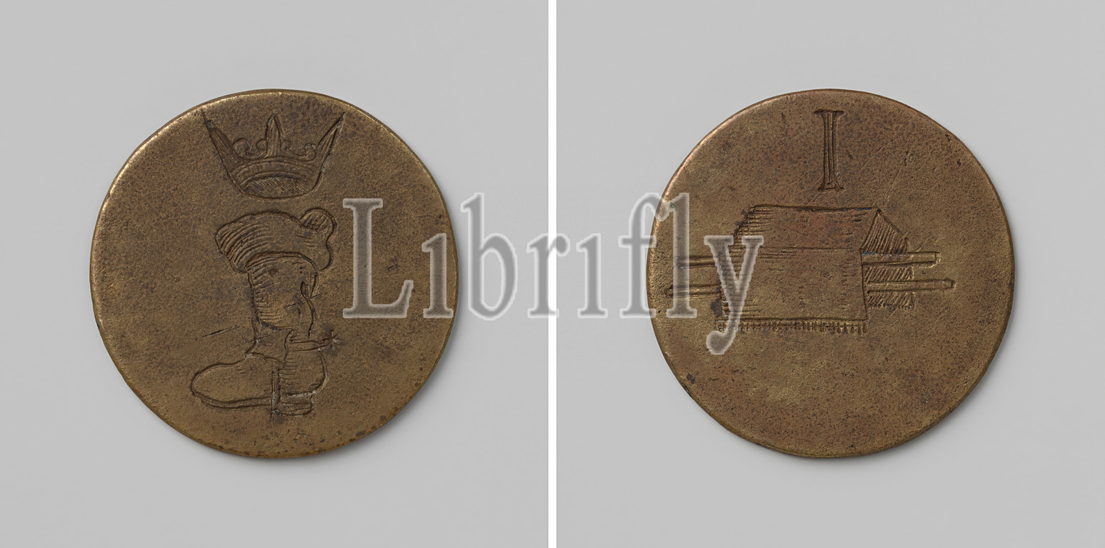 Shoemaker's Guild, funeral token with no. 1, Brass token. Front: speared boot under crown. Reverse: coffin with staves under death cover under Roman numeral I, anonymous, Netherlands, c. 1400 - c. 1885, brass (alloy), engraving, d 3.2 cm × w 9.79 gr
