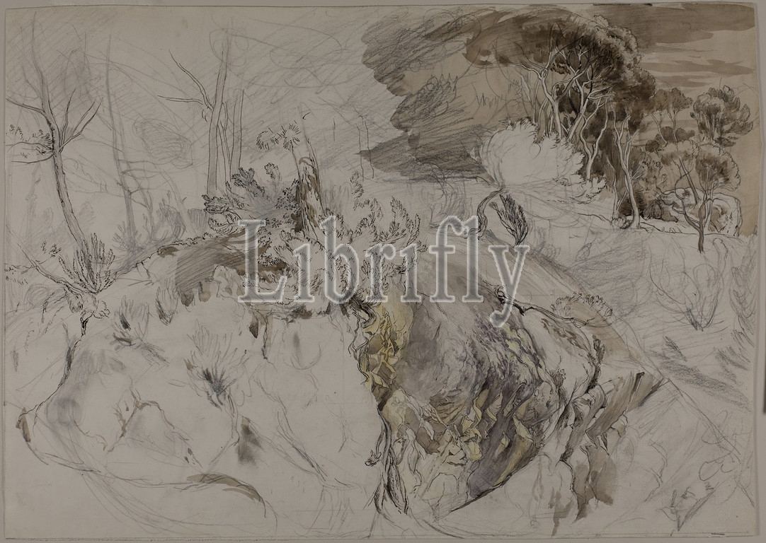 Shrubs, Trees, Rocky Landscape, c. 1845, John Ruskin, English, 1819-1900, England, Pen, brown ink, brush, watercolor, graphite, ivory wove paper, 140