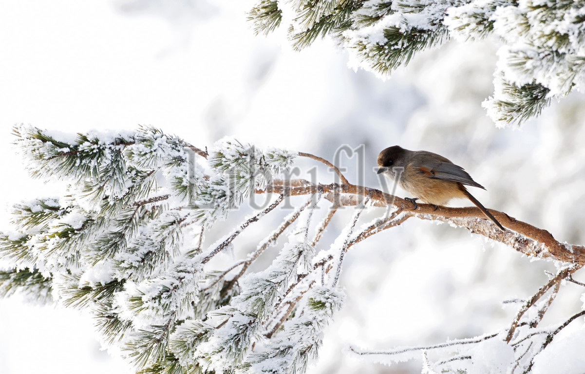 Siberian Jay perched on a snow covered tree, Perisoreus infaustus, Finland