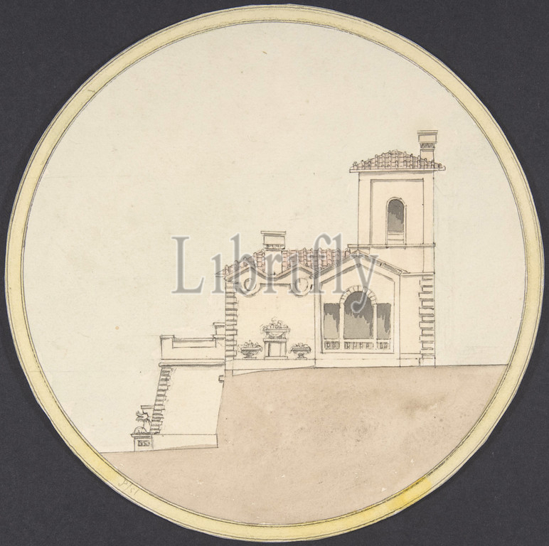 Side Elevation, Italian Villa Style House, 1851, Ink, watercolor washes, circular sheet, diameter 6 5/8, 16.7 cm, Anonymous, British, 19th century