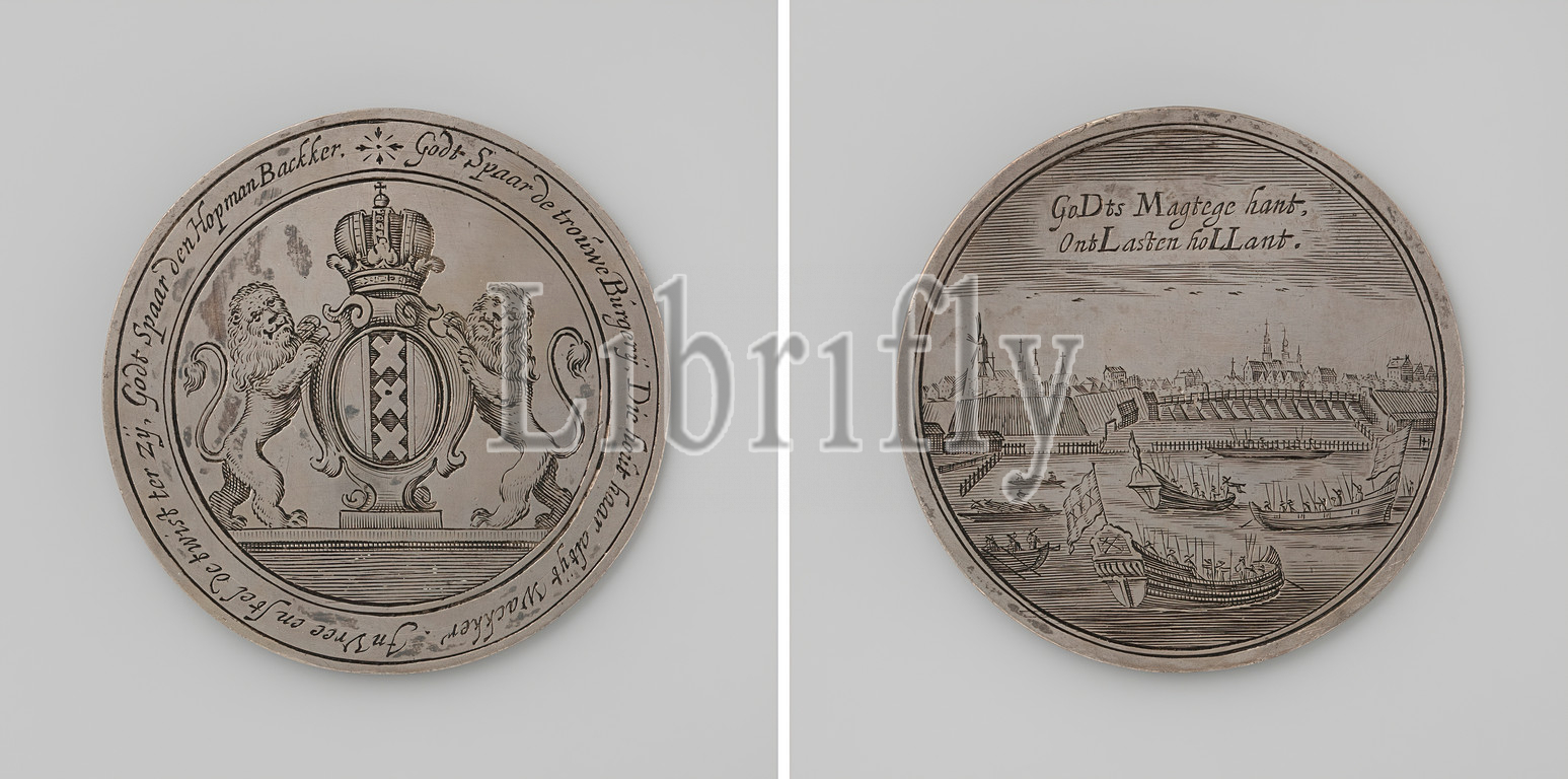 Siege, Amsterdam, Willem II, black-and-white Medal, Front, crowned coat, arms, Amsterdam flanked, two lions, circle, Reverse, view, ships, Amstel, inscription, Prince, Orange, 1650, black-and-white, metal, engraving