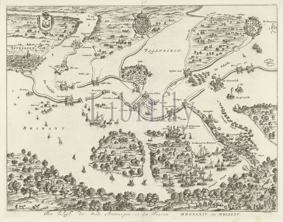 Siege of Antwerp in the years 1584 and 1585 The siege of Antwerp in the years MDLXXXIV and MDLXXXV (title on object), Siege of Antwerp in the years 1584 and 1585. Plan of the surrounding country with the ship bridge built in the middle by the duke of Parma in the Scheldt, the land flooded and, on the right, the fighting around the Kauwenstein dike. Above left the coat of arms of Antwerp. Above, in the middle, the arms of Philip II. Above right the arms of the Duke of Parma, siege, position war, pontoon bridge, Antwerp, Scheldt, Jan Luyken (mentioned on object), Amsterdam, 1680 - 1684, paper, engraving, h 275 mm × w 352 mm