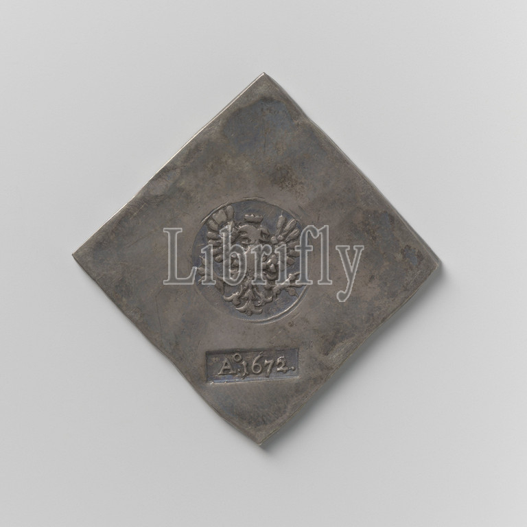 Siege of Deventer, emergency currency made from council silver to pay the war costs, diamond shaped emergency currency. Front: two stamps: large, round stamp: crowned eagle, below: rectangular stamp with year. Reverse: engraved inscription: 'Through vyand's maght and paap's violence our luster is in full force, H. N.', Deventer, Lucas Lucassen, Kampen, 21-Jun-1672, silver (metal), engraving, h 5 cm × w 4.9 cm × w 27.81 gr
