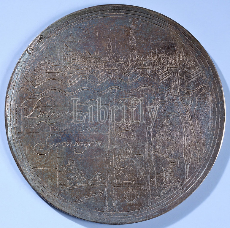 Siege, Groningen, Bronze Medal, Front, view, city, besiegers, left inscription, middle, Reverse, crowned, double-headed eagle, coat, arms ends claws cloth, inscription, 1672, bronze, metal, engraving