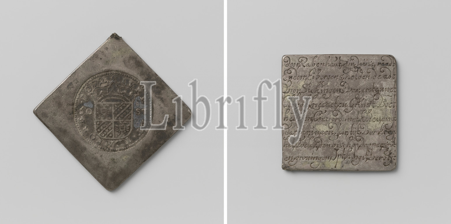 Siege of Groningen and capture of Coevorden, diamond shaped emergency coin with rounded corners. Obverse: crowned coat of arms (small stamp) between the indication of the value within the inscription. Reverse: inscription 'by Rabenhaupt his wise advice And by Eibergens heroes acts Four Sickingens of great must have Clingh, Losecaet and Gruis t Voet Coeverd: with klien magt brave in an uir tijt The Welck boldly regrets regret and groningen Opt highly Verblyt', Groningen, Coevorden, Karl Rabenhaupt (baron von Sucha), anonymous, 1672, silver (metal), engraving, h 4.8 cm × w 4.8 cm × w 28.17 gr