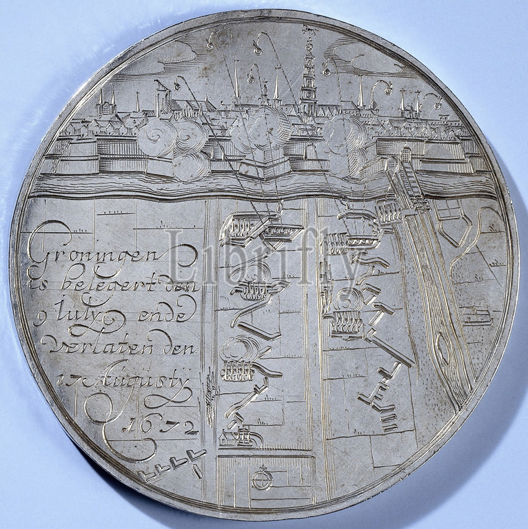 Siege, Groningen, capture, Coevorden, black-and-white Medal, Front, view, city, besiegers, shooting, left inscription, middle, Reverse, map, inscription, 1672, black-and-white, metal, engraving