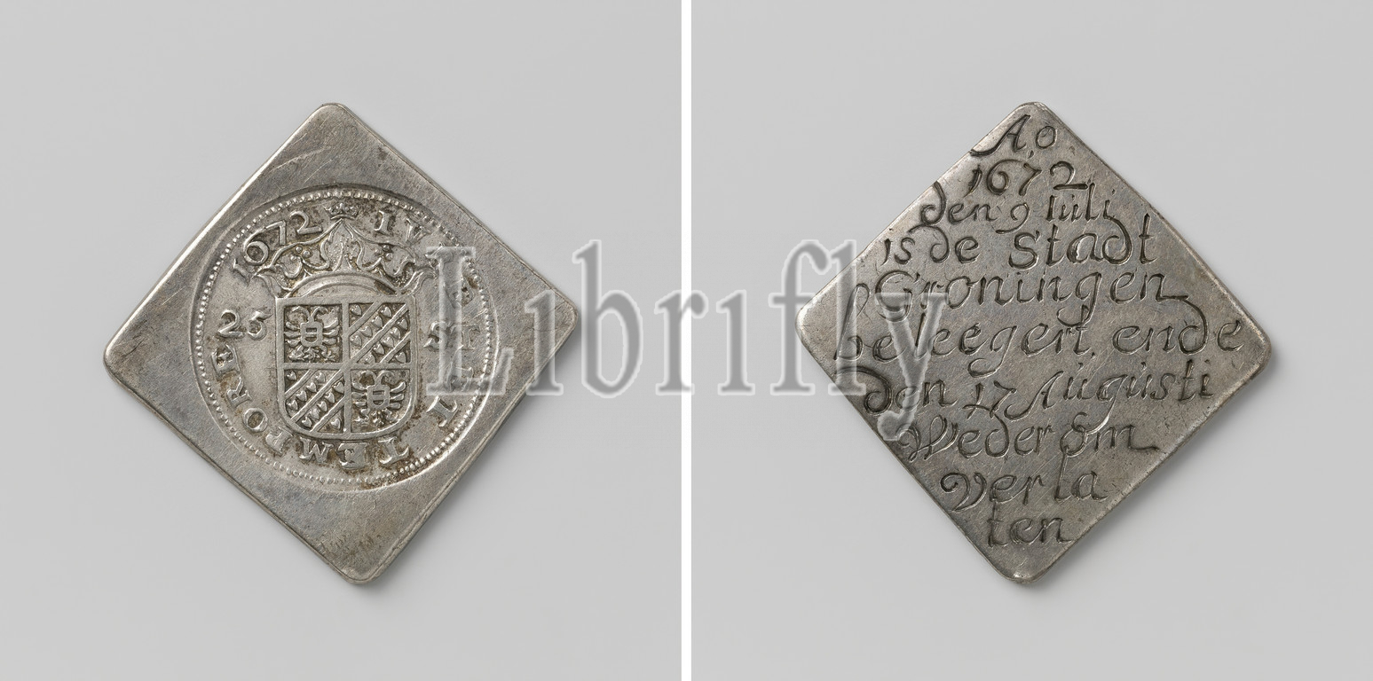 Siege of Groningen, diamond-shaped silver emergency coin of 25 pence with rounded corners. Obverse: crowned coat of arms between the value indication within the cover. Reverse: inscription, Groningen, anonymous, 1672, silver (metal), engraving, h 2.8 cm × w 2.7 cm × w 13.56 gr