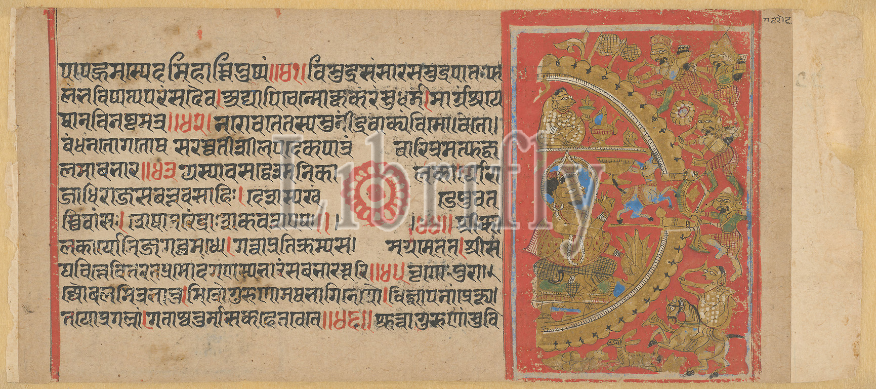 The Siege of Ujjain and the Magic Donkey, page from a copy of the Kalakacharyakatha, c. 1450, India, Gujarat, India, Opaque watercolor and gold on paper, Image: 10.1 x 6.9 cm (3 15/16 x 2 11/16 in. ), Paper: 11.3 x 25.3 cm (4 7/16 x 9 15/16 in.)