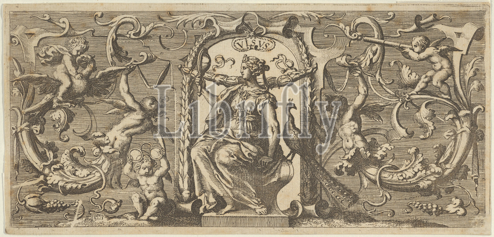 Sight (Visus), from Quinque Sensuum, ca. 1655, Engraving, Sheet: 3 3/4 × 7 15/16 in. (9.5 × 20.2 cm), Franz Cleyn (German, Rostock 1582–1658 London), Horizontal panel with the personification of Visus (Sight) shown as a female figure looking at herself in a mirror, under an arch formed from strapwork and garland at center. Around the arch, inhabited scrollwork and putti, including a putto riding an eagle at upper left, one with glasses at lower left, and another with a spyglass at upper right