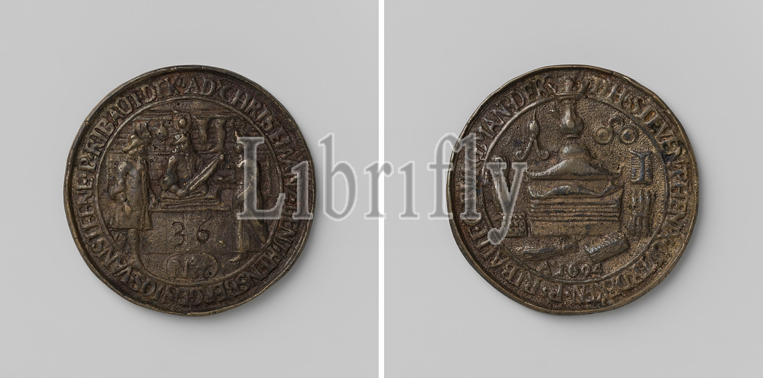 Silk cloth buyers' guild of Vlissingen, guild token with no. 36, Brass token. Front: cloth merchant, standing behind the counter in his shop, measuring with a piece of fabric, left and right: male and female, between the two, on the counter: the number 36 above the compartment containing the number 36 inside the cover. Reverse: crowned bottle above hat, around it: glasses, guy, comb, two skeins of knitting yarn, etc. above year in a round, Flushing, Steven Phenix, Ps. Ribaut, G. Burgman, Ad. Christiaanz, Benjamin Hensbergen, Jos. Steene, P. Ribaut, anonymous, 1694, brass (alloy), engraving, d 5.2 cm × w 36.72 gr