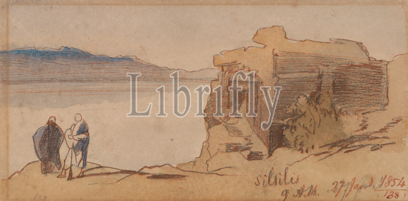 Silsilis, Edward Lear, 1812–1888, British, 1854, Watercolor, graphite, pen, red ink, moderately thick, rough, beige wove paper, Sheet, desert, figures, representations, landscape, men, river, river, robes, ruins, structure, single built work, temple, water, Africa, Aswan, Egypt, Nile