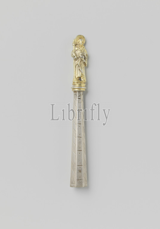 Silver spoon end ending in an apostle figure, Silver spoon end with the gilded statue of an apostle at the end, anonymous, Germany, c. 1600 - c. 1625, silver (metal), gilding, l 8.9 cm