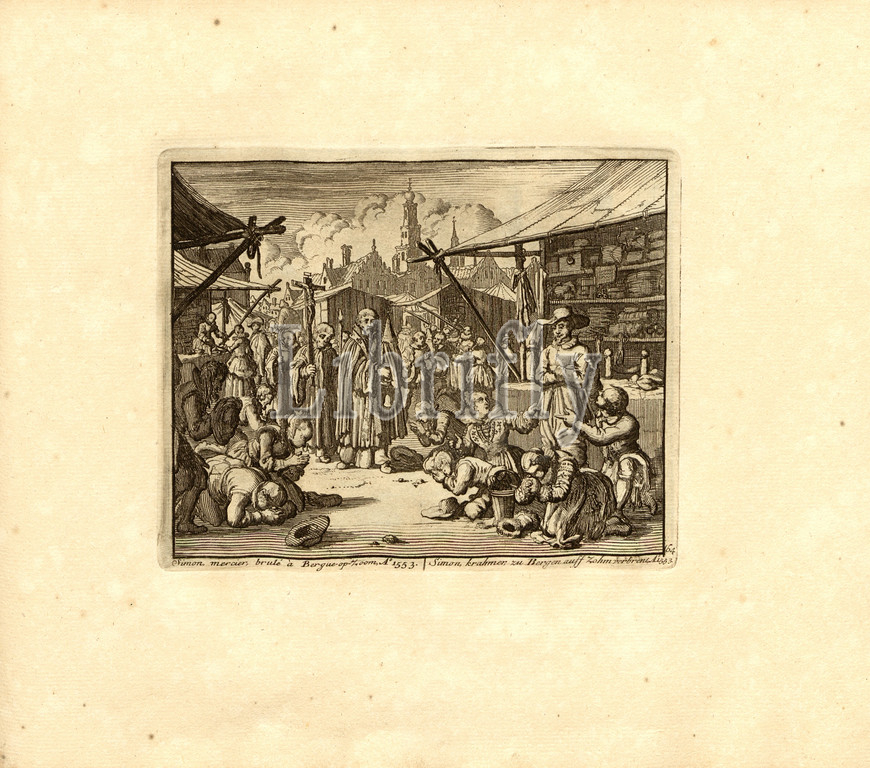 Simon mercier, burned at Bergue-op-Zoom, Anno 1553, Parallel title: Simon Krahmer to Bergen auff Zohm gezent, A nn o 1553, copperplate engraving, 64.), p. 137, Luyken, Jan (inv. et fec.), Jan Luyken: Théâtre des martyrs: depuis la mort de J.Christ jusqu'à present: représenté en très belles tailles-douces = Schau-Bühne der Martyrer; gezeichnet und in Kuppfer gestochen. Leyde: chez Pierre Van der Aa, [1711]