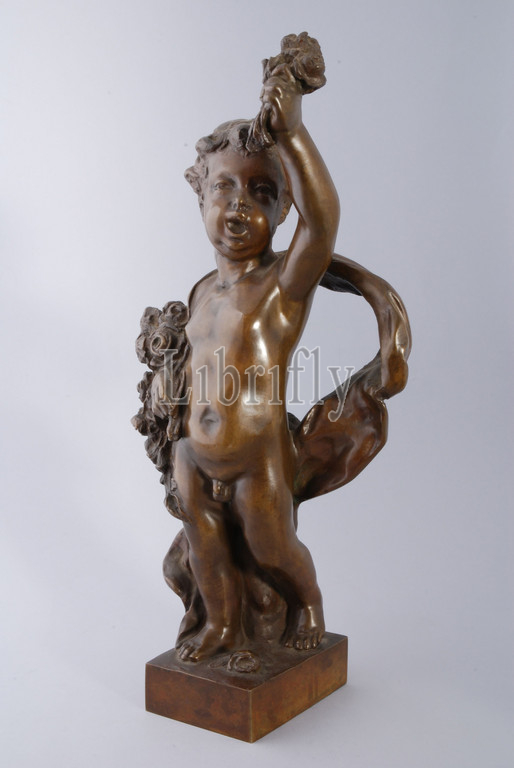 Simon Miedema, Cast bronze statue of child with flowers in hand, spring, from series the seasons, sculpture sculpture bronze metal, cast Series = spring - summer - autumn - winter cupboard furniture furniture crowning Made on behalf of J.P. van der Schilden as crowning box designed by him.