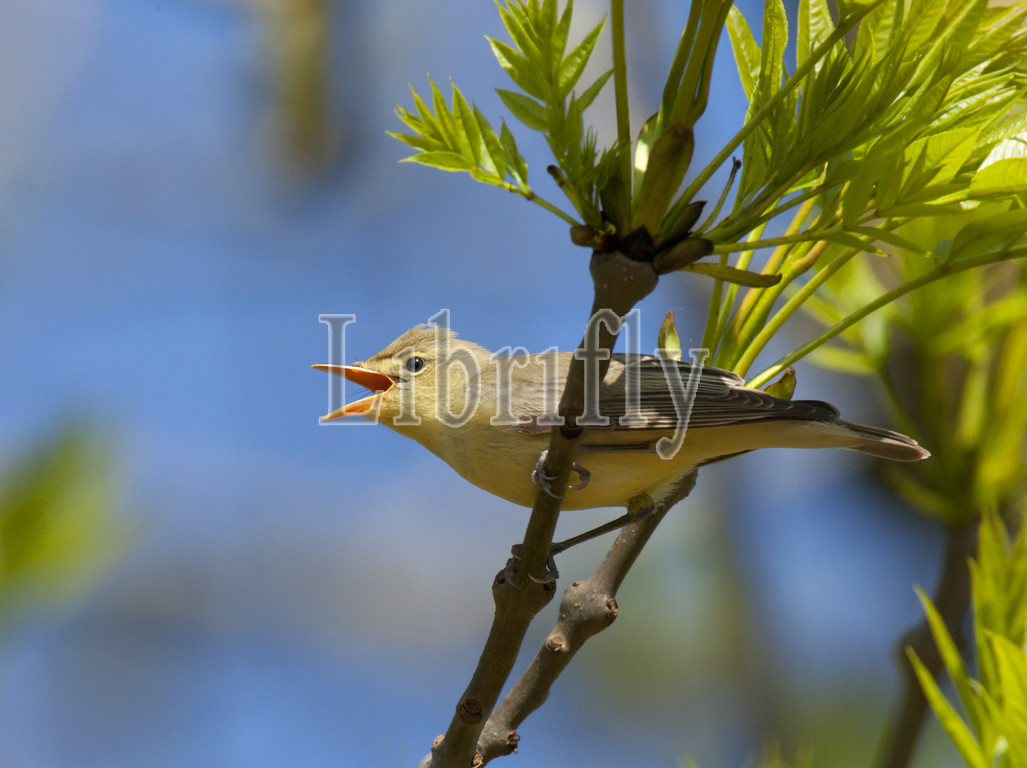 Singing Icterine Warbler, sitting, Ash, young leafs, Hippolais icterina, Netherlands, nature, bird, animal, wildlife, wild, fauna, natural, feather, sky, beak, wing, outdoor, freedom, colourful, Liszt, Natural History, ornithology, vertebrate animals, photography, color image