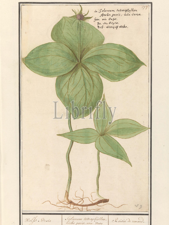 Single berry, Paris quadrifolia, Wolfs Besie, Solanum tetraphijllon, herba paris, uva versa, Raisin de renard, title, object, Eenbes, wolfsbes, Numbered top right, 177, Top right, name, four languages, Part, second album, drawings, flowers, plants, Ninth, twelve albums, animals, birds, 1600, commissioned, Emperor Rudolf II, explanation, Dutch, Latin, French, Anselmus Boetius de Boodt, 1596, 1610, paper, watercolor, paint, deck paint, chalk, ink, pen