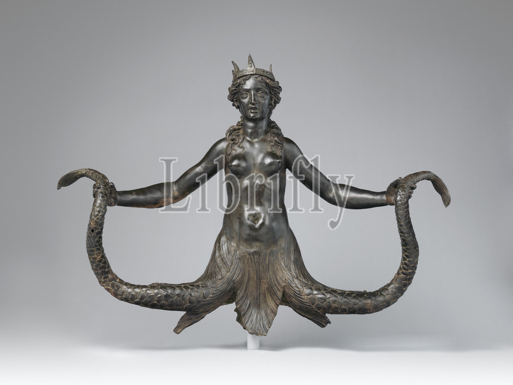 Siren, ca, 1571–90, Italian, Rome, Bronze, Overall, confirmed, H, 32 1/8 x W, 44 3/4 D, 13 3/8, 130lb, 81.6 113.7 34 cm, 58.9676kg, Sculpture-Bronze, Direct, dramatic, bronze half-length statue, represents, nude woman, aquatic, waist down, holds, scaly tail, hand, long hair, trails, set, fish gills, fan out, sides, body