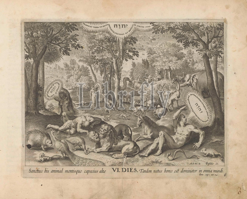 Sixth creation day, creation, Adam, Eve Creation, world, series title, Den Grooten Figuer-Bibel, midst, animals Adam, Eve created, God, Father, form, tetragram, right foreground, God bends, left, Eve, created, Adam's rib, middle two lions, unicorn, animals, middle, background, God gives Eve, sixth day, God created Adam, performance, reference, Latin, Bible text, Gen, 1, 24, print, part, album, land-animals, man, Garden, Eden, Genesis 1, 26, 2, beasts, prey, predatory animals, lion, Roman, Hebrew script, symbol, 1639, 1646, paper, engraving