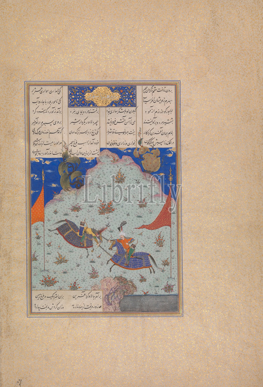 'The Sixth Joust of the Rooks: Bizhan Versus Ruyyin', Folio 343r from the Shahnama (Book of Kings) of Shah Tahmasp, ca. 1525–30, Made in Iran, Tabriz, Opaque watercolor, ink, silver, and gold on paper, Painting (recto): H. 6 1/16 x W. 6 3/4 in. (H. 15.4 x W. 17.1 cm), Codices, Painting attributed to 'Abd al-Vahhab, Folio 343r: The Sixth 'Joust of the Rooks': Bizhan versus Ruyin In the sixth joust Bizhan, Giv's son, takes on Ruyin, son of Piran. When arrows make no dent in the armor of either soldier, Bizhan steers his horse alongside Ruyin and crashes his mace down on his foe's head