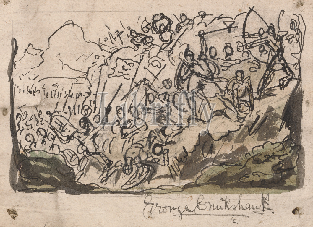 Sketch for the Scene of a Battle, George Cruikshank, 1792–1878, British, undated, Pen and black ink with watercolor on medium, slightly textured, cream wove paper mounted on moderately thick, slightly textured, gray wove paper, Mount: 7 7/8 x 8 inches (20 x 20.3 cm) and Sheet: 4 1/8 x 5 9/16 inches (10.4 x 14.2 cm), armed forces, battle, figures, military art, soldiers, study (visual work), war