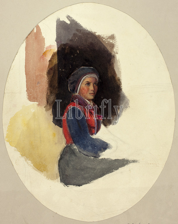 Sketch of Seated Woman in Peasant Costume, n.d., After John Frederick Lewis, English, 1805-1876, England, Watercolor over graphite, on ivory wove paper, tipped onto gray wove paper, 253 mm × 200 mm