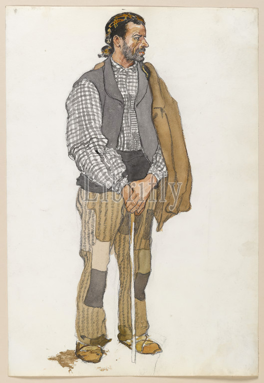 Sketch of a Spanish Man, Edward Penfield, American, 1866-1925, Watercolor and graphite on paper mounted in scrap book, 1906, sheet: 11 5/16 x 7 11/16 in., 28.7 x 19.5 cm, American, beard, cane, character, drawing, fine lines, man, patchwork, portrait, tramp, walking stick, watercolor