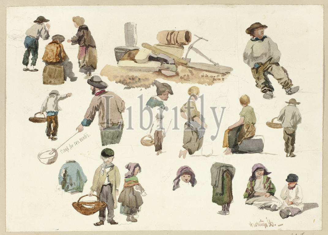 Sketches of Fishermen and Children at Hastings, 1866, Unknown Artist, English, 19th century, England, Watercolor over graphite, on ivory wove paper, tipped onto gray wove paper, 251 × 353 mm