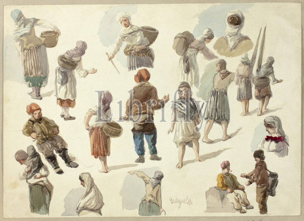Sketches of Peasants in Boulogne, 1868, Unknown Artist, English, 19th century, England, Watercolor over graphite, on ivory wove paper, tipped onto gray wove paper, 254 × 353 mm