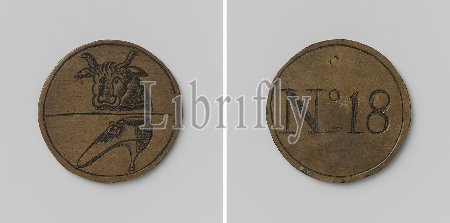 Skin buyers, tanner and shoemakers' guild of Amsterdam, guild token with no. 18, Brass token. Front: flat horizontally divided in two, above: ox head, below: shoe. Reverse: number 18, Amsterdam, anonymous, 1664, brass (alloy), engraving, d 3.3 cm × w 11.19 gr
