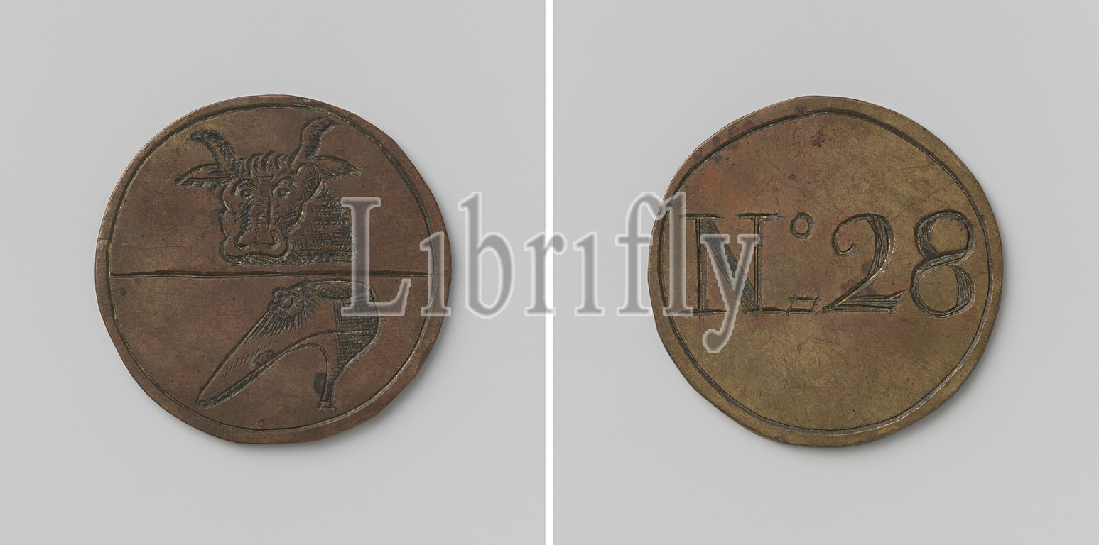 Skin buyers, tanner and shoemakers' guild of Amsterdam, guild token with no. 28, Brass token. Front: flat horizontally divided in two, above: ox head, below: shoe. Reverse: number 28, Amsterdam, anonymous, 1664, brass (alloy), engraving, d 3.3 cm × w 10.88 gr