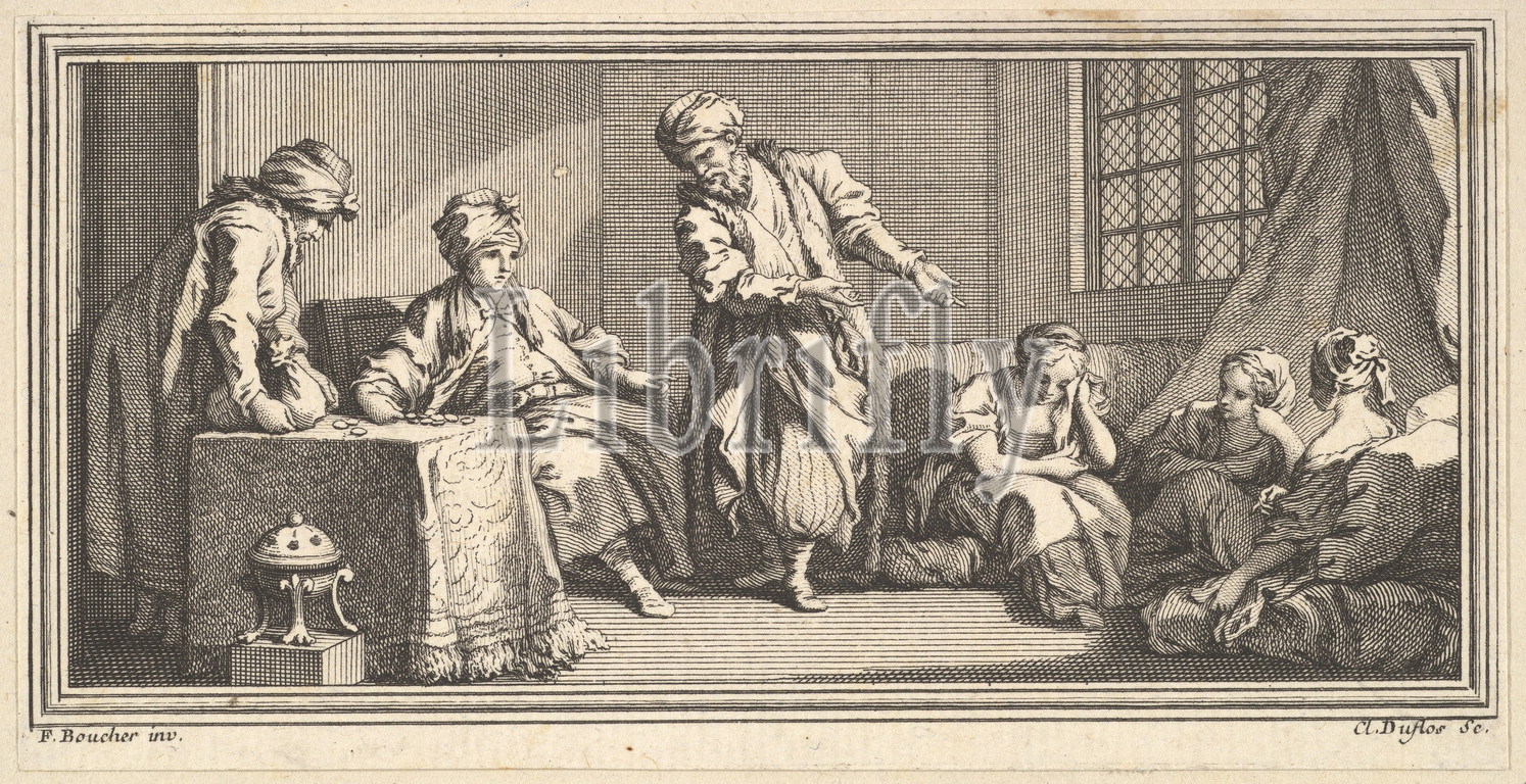 Slave Merchant, 1746–47, Etching, engraving, Sheet, trimmed, 2 5/8, 5 1/4, 6.7, 13.3 cm, Prints, Claude Augustin Duflos le Jeune, French, Paris, 1700–1786, After François Boucher, 1703–1770