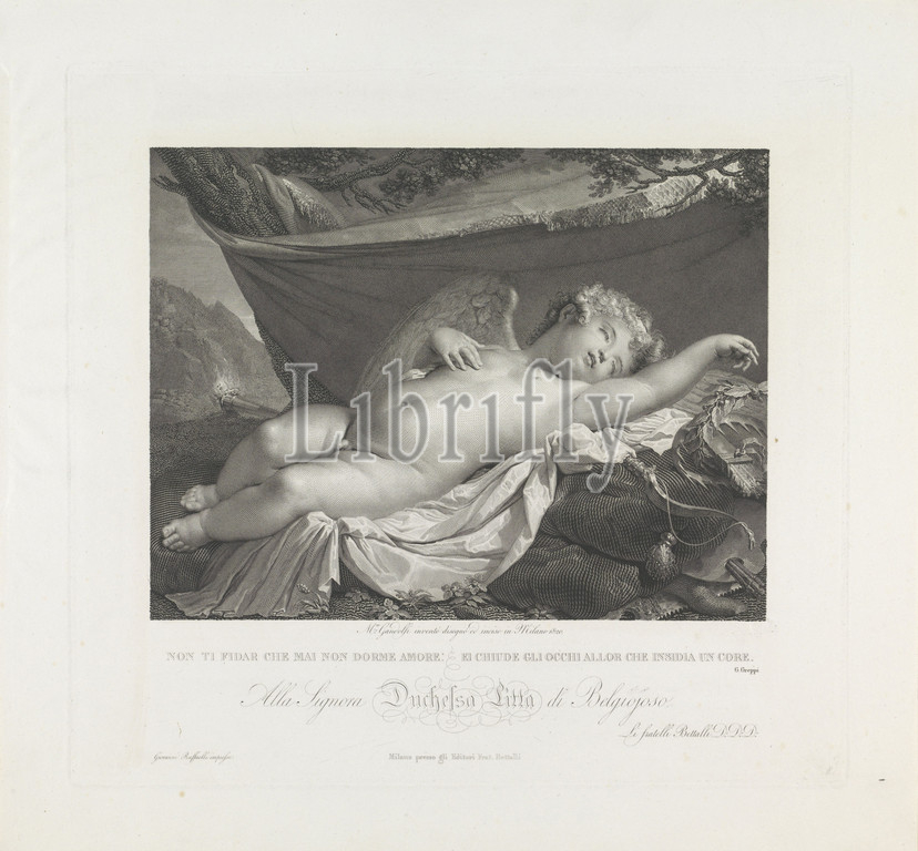 Sleeping Amor Non ti fidar che mai non dorme Amore, egg chiude gli occhi allor che insidia, core, title, object, sleeping Amor, landscape, lies, burning torch, foreground, arrows, bow, painter's palette, brushes, laurel wreath, Sleeping, unconsciousness, story, Cupid, Amor, Eros, sleeping Cupid, signifying, slackening, Love's influence, Mauro Gandolfi, mentioned, 1820, paper, engraving