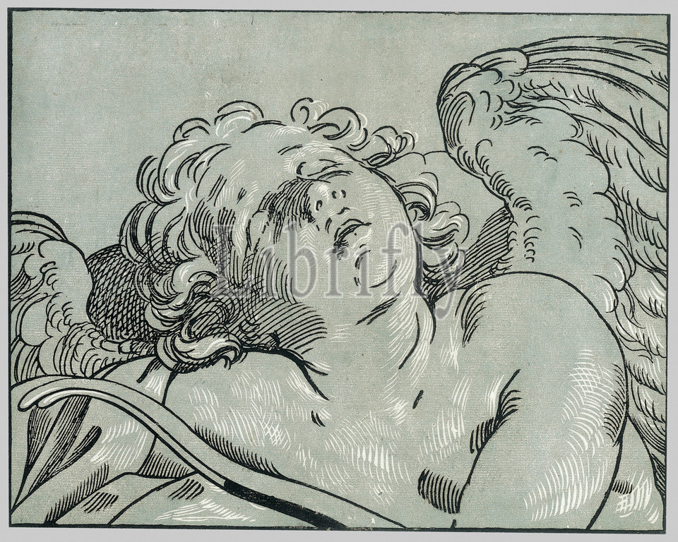 sleeping cupid, 1630–45, Chiaroscuro woodcut, blue-gray, black printed, two blocks, Sheet, 11 5/8, 14, 29.5, 37.2 cm, Prints, Bartolomeo Coriolano, Italian, Bologna ca., 1599–ca., 1676, Bologna, After Guido Reni, 1575–1642, statues, cupids, survived, antiquity, inspiring artists, Michelangelo, François Duquesnoy, sculpt, own versions, Reni, painted representations, infants, Christ Child, particularly prized, print, seventeenth-century art, historian, Carlo, Cesare, Malvasia, famous head, Cupid