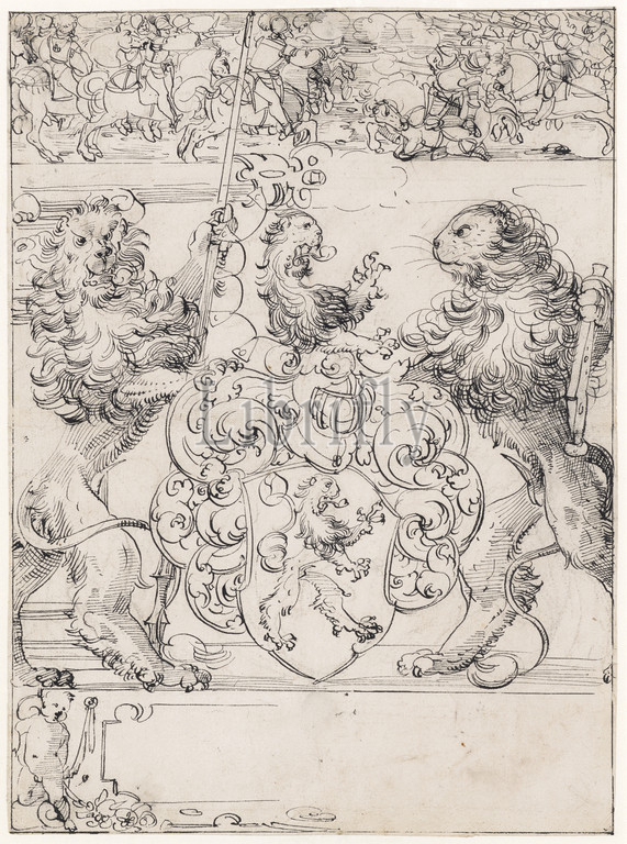 Slice rupture with two lions as shield holders and lion coat of arms, in the Oberbild riding battle, feather in black, remains of a preliminary drawing with black pencil, sheet: 43 x 31.8 cm, unmarked, Anonym, Schweiz (Basel), 16. Jh.