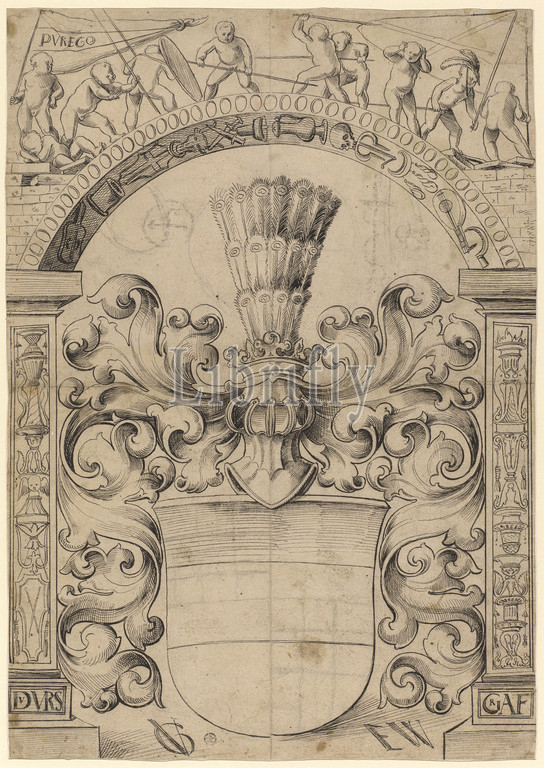 Slice tear with the coat of arms of Austria, in the upper picture Putten in the fighting game, around 1511, feather in black, remains of a preliminary drawing with black pencil, verso: brush samples in green and purple, sheet: 43.9 x 30.9 cm, O. inscribed on the banner: PVREGO, u, ., l, ., and r., inscribed on the pedestals: DVVRS, GRAF, u, ., M. l., monogrammed: VG [lig.], u, ., M. r., denotes: EW, Urs Graf, Solothurn um 1485 – 1527/28