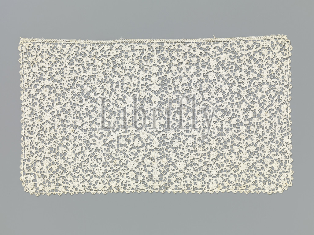 Slip from a jabot of needle lace, Slip from a jabot of natural colored needle lace: flat Venetian lace. On either side of a middle motif of flower vases, curls and flowers is a symmetrical drawing of vases with flowers in a diamond shape of C-curls surrounded by irregular flower sprays. The motifs are made with festoon stitches, with cut-outs of simple patterns in different flowers and leaves. The motifs are connected to each other by a hexagonal, coated barbed ground. The briefs are finished on three sides with a straight edge with painted bows. One long side is finished with a clasped edge., anonymous, Europe, c. 1700, linen (material), flat Venetian (needle point), l 36 cm × w 21 cm
