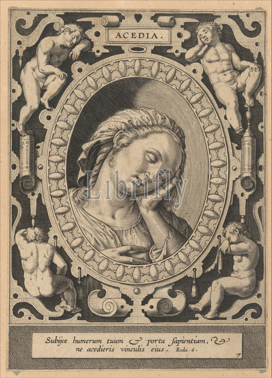 Sloth, Acedia, Seven Vices, 1612, Engraving, second state, two, Sheet, 7 5/16 x 5 1/4, 18.5 13.3 cm, Prints, Hieronymus, Jerome, Wierix, Netherlandish, ca., 1553–1619, Antwerp, After Philips Galle, Haarlem, 1537–1612