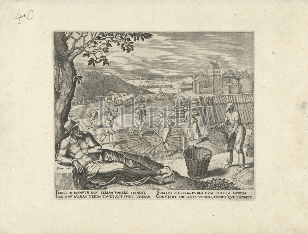 sloth lies under, tree, harvesting, sloth story, series title, hilly landscape, farmers, grain harvest, Four men thresh, grain, background two men work, field, plow, man sows new corn, sleeps, Rest, harvest, eating, dancing, love, etc, threshing, Philips Galle, Haarlem, c, 1565, paper, engraving