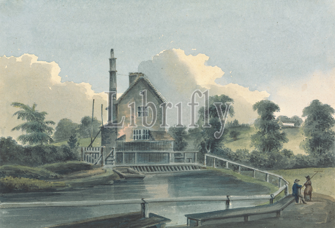 Sluice House, Hornsey, Middlesex, John Hassell, 1767–1825, British, ca, 1812, Watercolor, graphite, medium, slightly textured, cream wove paper, Sheet, architectural subject, clouds, fence, figures, hills, house, lake, trees, England, Europe, Hornsey, Middlesex, United Kingdom