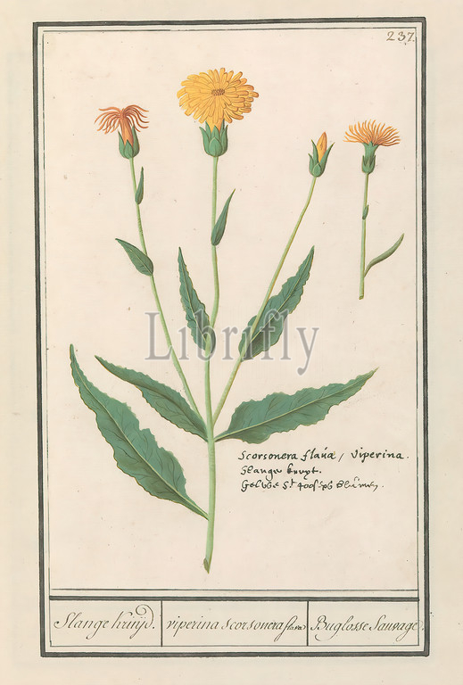 Small salsify, Scorzonera humilis, Snange Kruijd, viperina scorsonera flava, Buglosse Sauvage, title, object, Numbered top right, 237, Bottom right, name, three languages, Part, third album, drawings, flowers, plants, Tenth, twelve albums, animals, birds, 1600, commissioned, Emperor Rudolf II, explanation, Dutch, Latin, French, Anselmus Boetius de Boodt, 1596, 1610, paper, watercolor, paint, deck paint, chalk, ink, pen