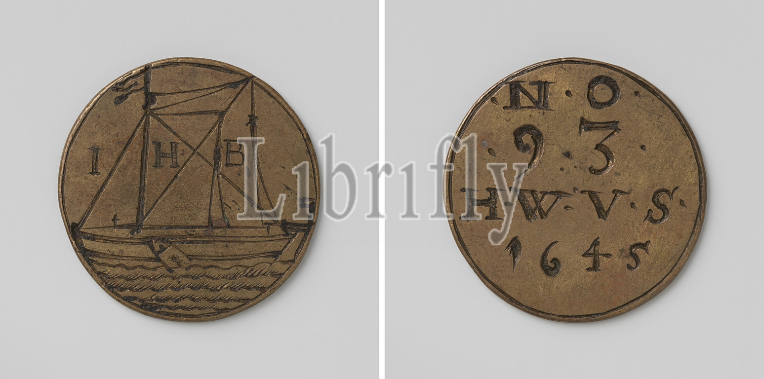 Small skipper's guild from Rotterdam, guild token with no. 93, Brass token. Front: sailing ship to the left, in souls: letters I, H and B. Reverse: inscription: N.O. 9.3, the letters H, W, V and S above year, Rotterdam, anonymous, 1645, brass (alloy), engraving, d 3.3 cm × w 10.69 gr