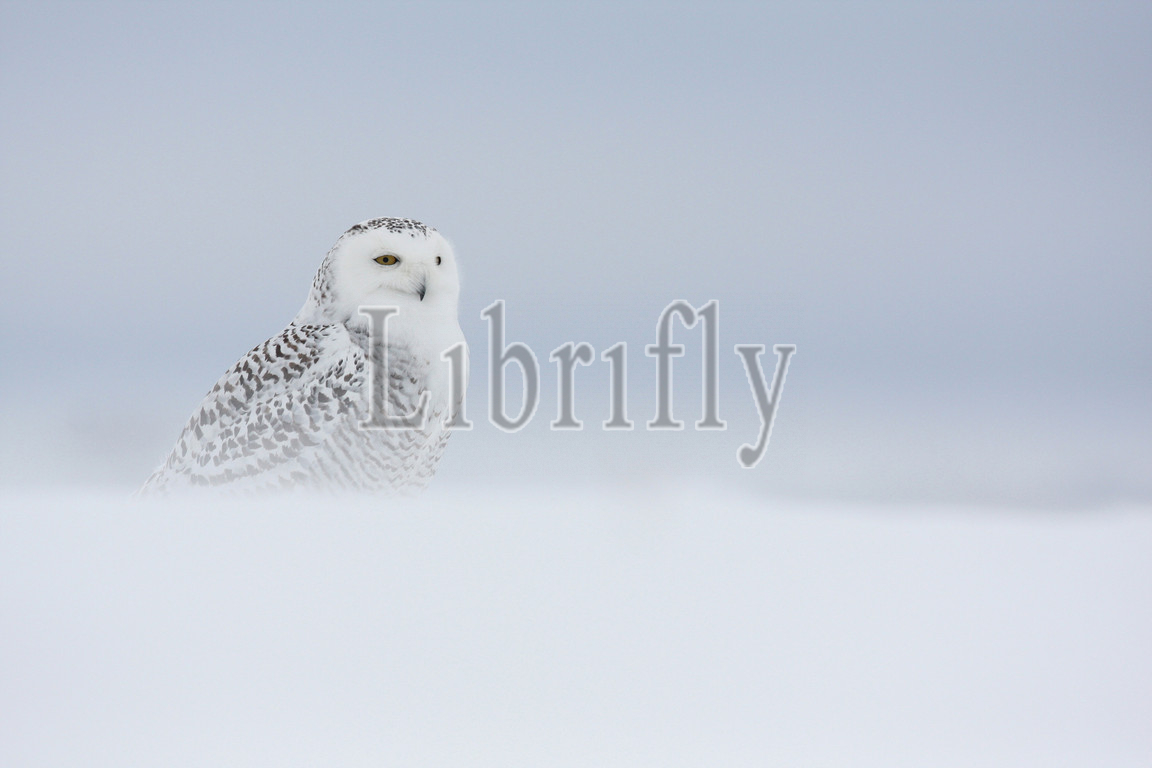 Snowy Owl perched in snow, Bubo scandiacus