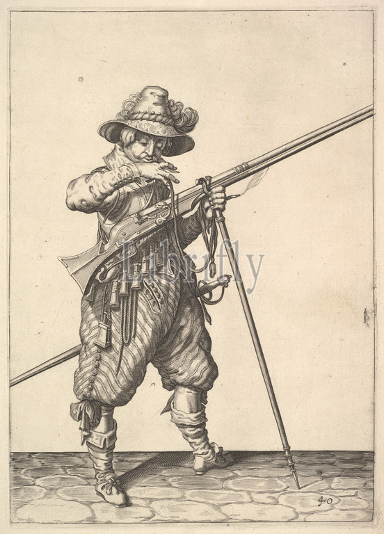 A soldier blowing on a match, from the Musketeers series, plate 40, in Wapenhandelinghe van Roers Musquetten Ende Spiessen (The Exercise of Arms), Engraving; third state of five (New Hollstein), plate: 10 9/16 x 7 1/2 in. (26.9 x 19.1 cm), Prints, Jacques de Gheyn II (Netherlandish, Antwerp 1565–1629 The Hague), From a series of 117 numbered plates from the military drill manual, 'Wapenhandelinghe van Roers Musquetten ende Speissen' (The Exercise of Arms). The series is divided into three sets: Marksmen (42 plates), Musketeers (43 plates), and Lansquenets (32 plates)