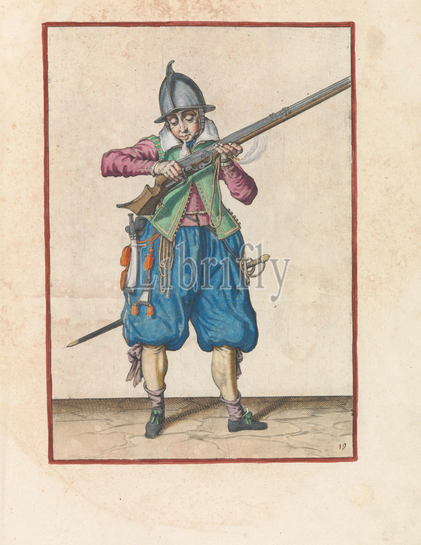 Soldier who blows gunpowder from his rudder Corte onderwysinghe on the figuerliicke afbeeldinghe, interested in the right ghebruyck des Roers (original series title), A full-length soldier with a rudder with both hands ( a certain type of firearm) to his mouth and blows over it, to remove any powder that has fallen outside the pan (the powder container). In his left hand, besides the course of the rudder, a burning fuse. This print is part of the series of 42 hand-numbered prints of gunmen in the arms handling, handling of weapons, military training, firearms: rifle, Jacob de Gheyn (II) (workshop of), The Hague, c. 1597 - 1607, paper, engraving, h 360 mm × w 260 mm