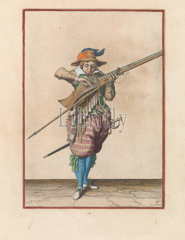 Soldier who blows his wick clean while covering the pan of his musket with two fingers against sparks Corte lower right on the figuerliicke image A full-length soldier holding a musket (a certain type of firearm) with his left hand. On the rooster (part of the ignition mechanism) of his musket lies the burning fuse. He blows over this, covering the pan (the powder container) of his musket with the forefinger and the middle finger of his right hand, to protect the powder from sparks from the fuse. This print is part of the series of 43 hand-numbered prints of musketeers in the Wapenhandelhe, handling of weapons, military training, firearms: rifle, Jacob de Gheyn (II) (workshop of), The Hague, c. 1597 - 1607, paper, engraving, h 360 mm × w 260 mm