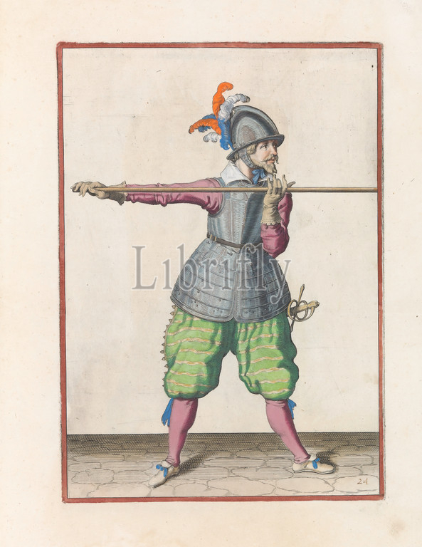 Soldier carrying, skewer, hands horizontally, shoulder height, right hand, foot, weapon Corte onderwysinghe, figuerliicke afbeeldinghe, interested t'recht ghebruyck, Soldaet, al t'ghene acting, Spies noodich, original series title, full-length soldier, carrying, spear, lance, base, weapon, print, part, series, 32 hand-numbered prints, skewers, Arms Act, handling, weapons, military training, helved weapons, polearms, striking, hacking, thrusting, Jacob de Gheyn, II, workshop, Hague, c, 1597, 1607, paper, engraving