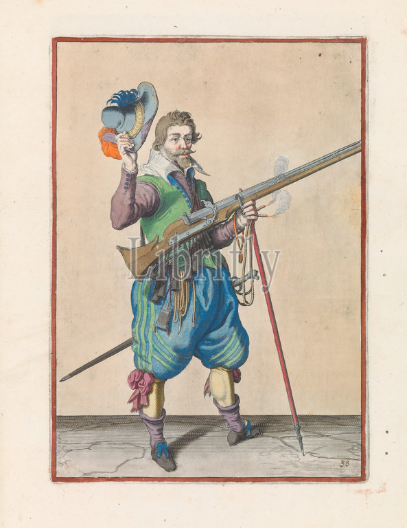 Soldier on guard holding his musket with his left hand tilted upwards with his right hand, while taking off his hat with his right hand Corte onderrechtinghe on the figuerliicke imagehe, soo many aengaet the right ghebruyck vant Musquet ( original series title), A soldier on guard, full-length, to the right, holding a musket (a certain type of firearm) at his right side, his left hand around the fork of the furket (musket fork) on which the barrel, tilted upwards, peace. A burning wick in his left hand. The soldier takes off his hat with his right hand. This print is part of the series of 43 hand-numbered prints of musketeers in the Wapenhandelhe, handling of weapons, military training, firearms: rifle, Jacob de Gheyn (II) (workshop of), The Hague, c. 1597 - 1607, paper, engraving, h 360 mm × w 260 mm