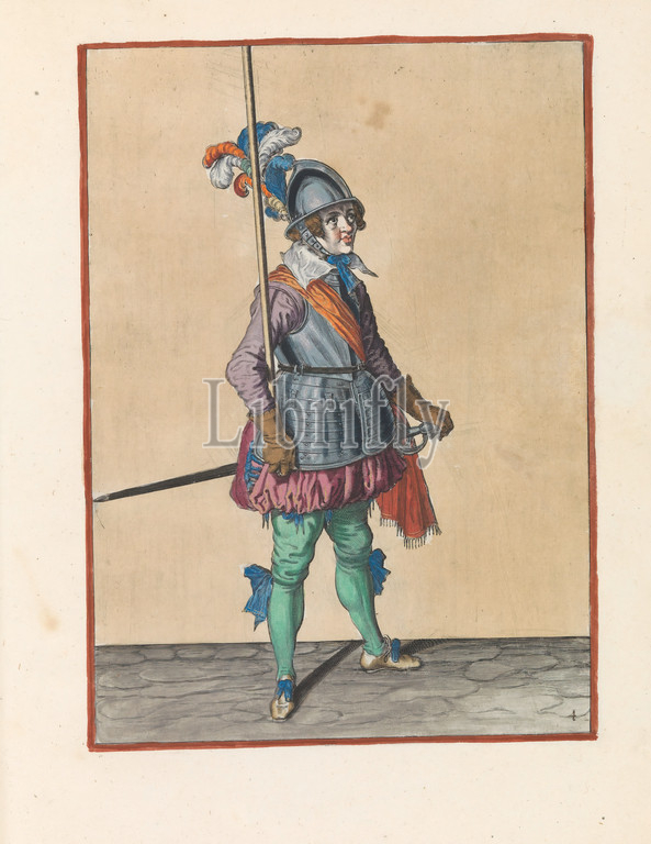 Soldier holding, skewer, right hand upright, bowl, right arm Corte onderwysinghe, figuerliicke afbeeldinghe, important t'recht ghebruyck, t'ghene, Soldaet, acting, Spies noodich, original series title, soldier, full-length, right, holding, spear, lance, right arm, third action, lifting, skewer upright, print, part, series, 32 hand-numbered prints, skewers, Arms Act, handling, weapons, military training, helved weapons, polearms, striking, hacking, thrusting, Jacob de Gheyn, II, workshop, Hague, c, 1597, 1607, paper, engraving