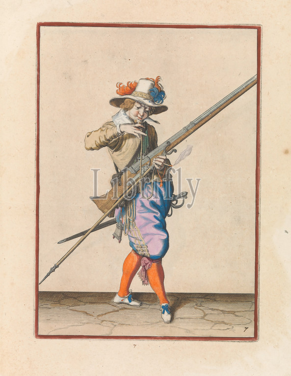 Soldier with a musket who brings his wick to his mouth to blow him clean Corte onderrechtinghe on the figuerliicke afbeeldinghe, soo much the right ghebruyck vant Musquet (original series title), A soldier, ten feet out, to the right, holding a musket (a certain type of firearm) with his left hand. With his right hand he brings a burning wick to his mouth to blow it clean. This print is part of the series of 43 hand-numbered prints of musketeers in the Wapenhandelhe, handling of weapons, military training, firearms: rifle, Jacob de Gheyn (II) (workshop of), The Hague, c. 1597 - 1607, paper, engraving, h 360 mm × w 260 mm