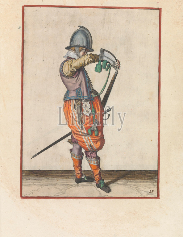 Soldier pouring gunpowder, course, rudder Corte underwater, figuerliicke afbeeldinghe, interested, right ghebruyck des Roers, original series title, soldier, full-length, right, holds, rudder, a certain type, firearm, left hand, left thigh, right hand, pours powder, powder horn, barrel, points obliquely upwards, print, part, series, 42 hand-numbered prints, gunmen, arms handling, handling, weapons, military training, firearms, rifle, Jacob de Gheyn, II, workshop, Hague, c, 1597, 1607, paper, engraving